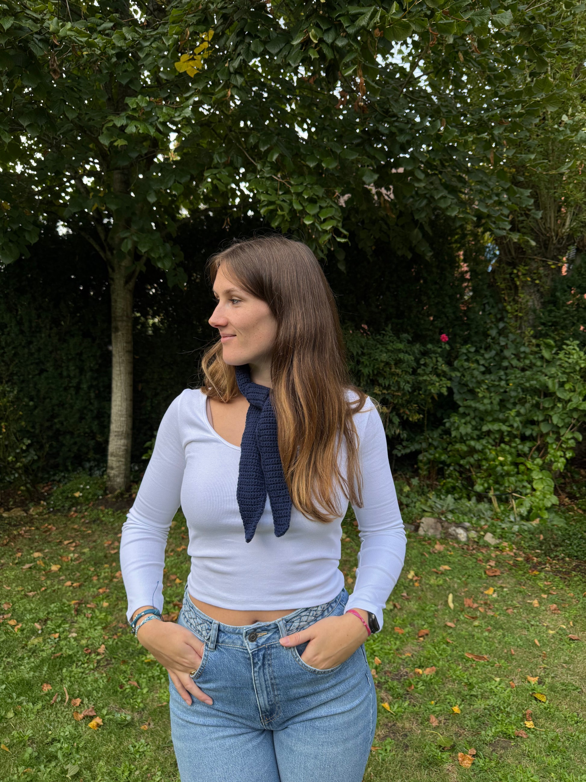 Elle est suffisamment longue afin de pouvoir se nouer facilement autour de votre cou.