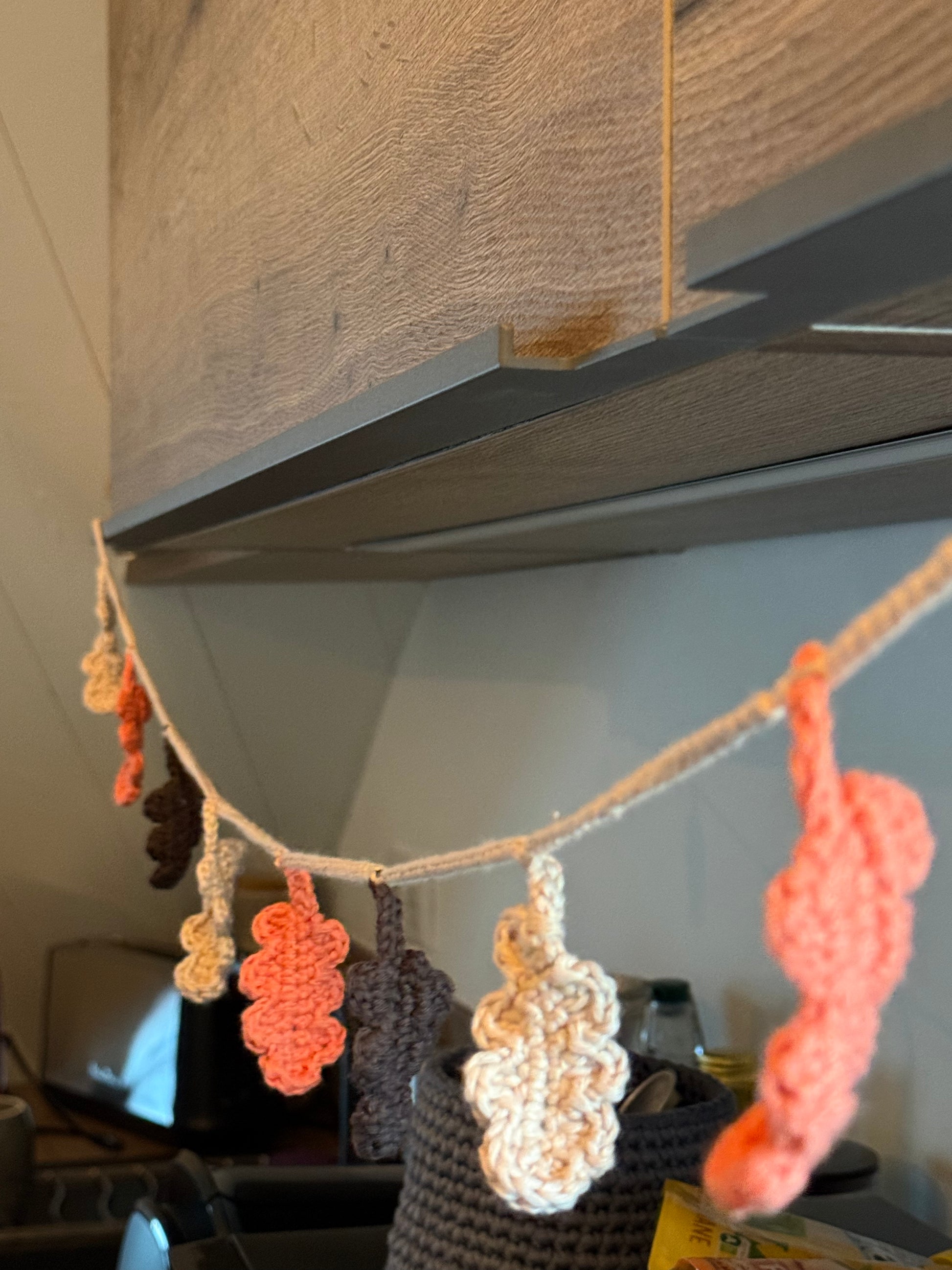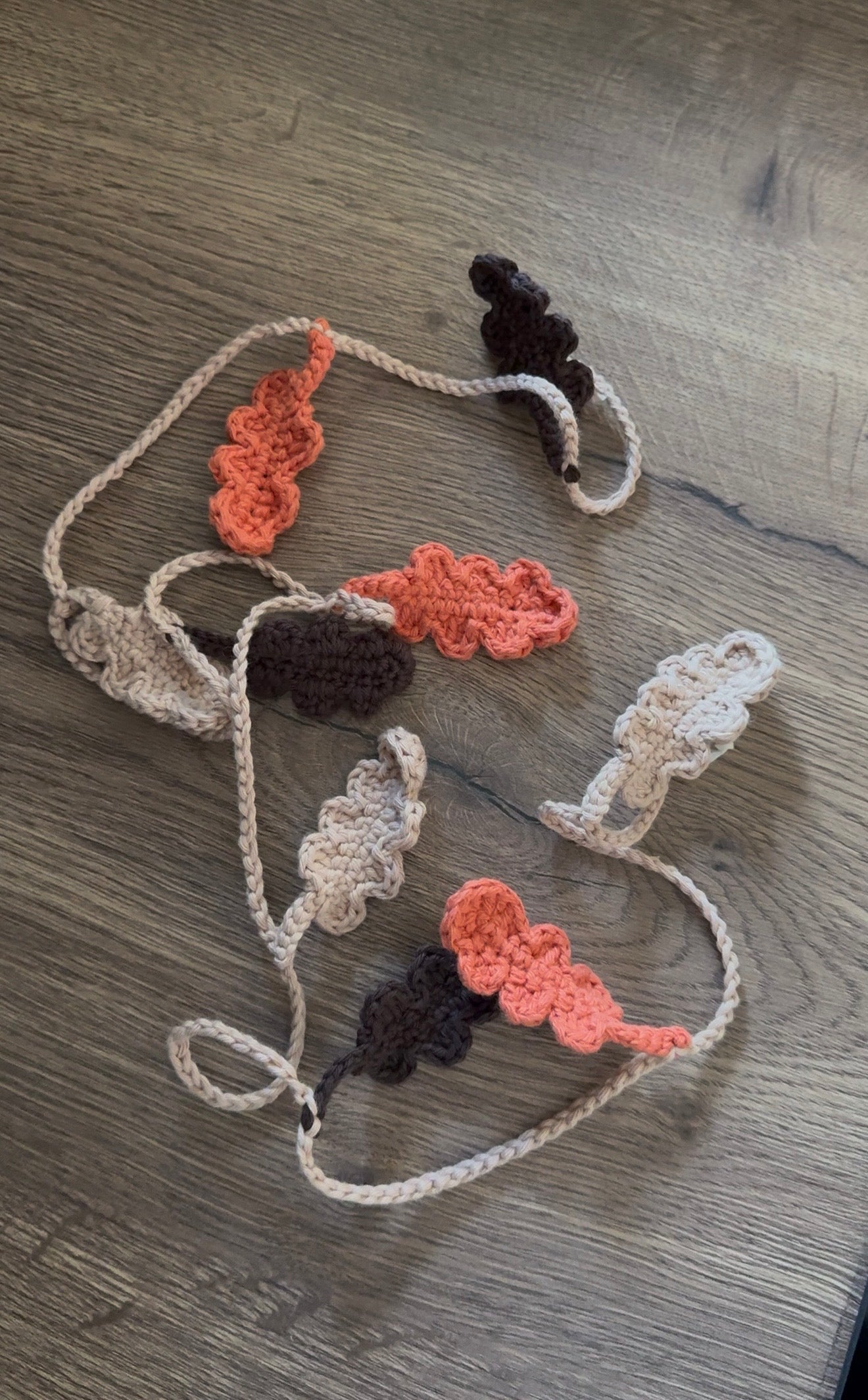 Cette guirlande est conçue pour décorer vos maisons pour l'automne. Elle est réalisée à partir de feuilles crochetées en coton et dans différents coloris.