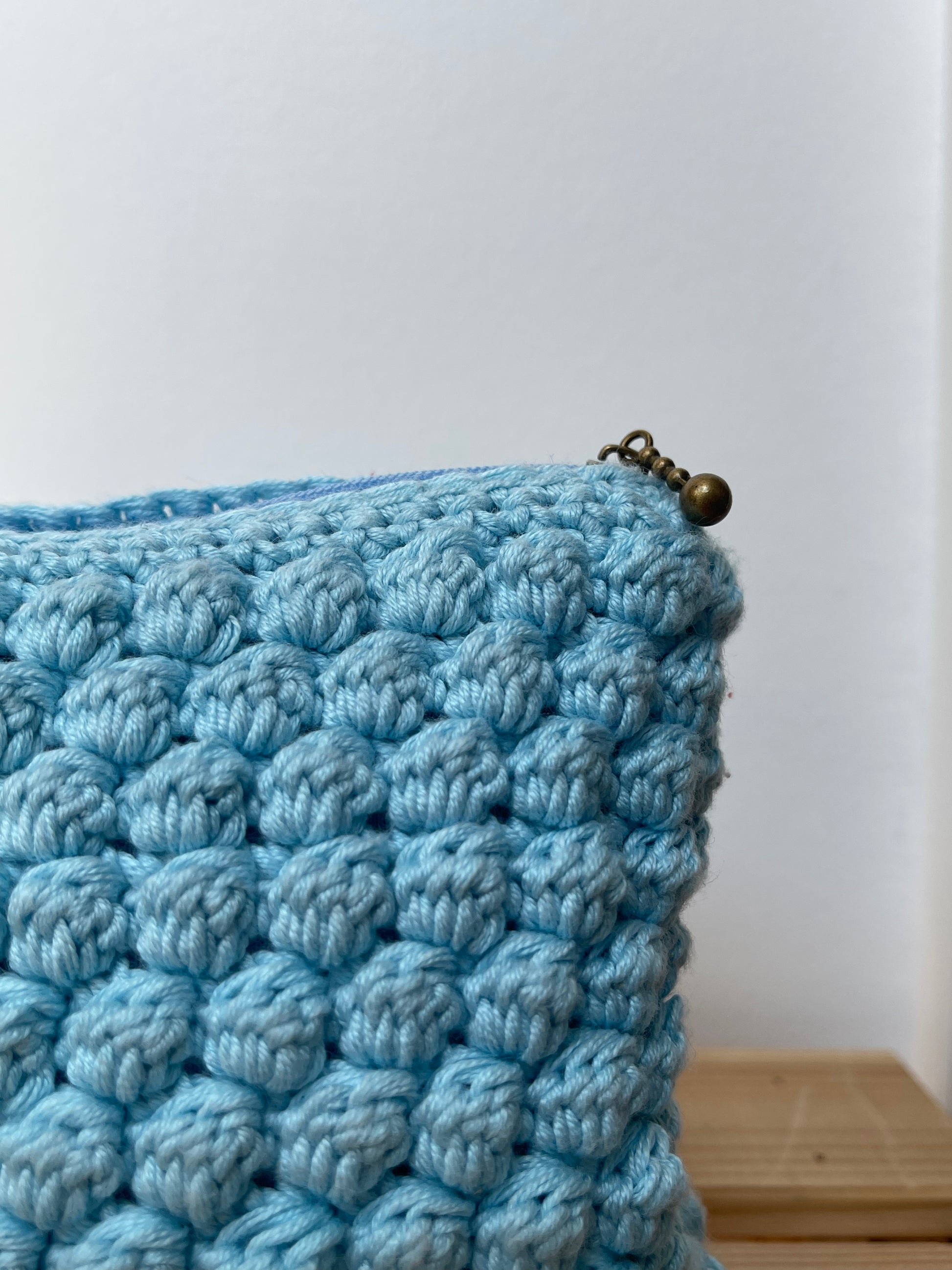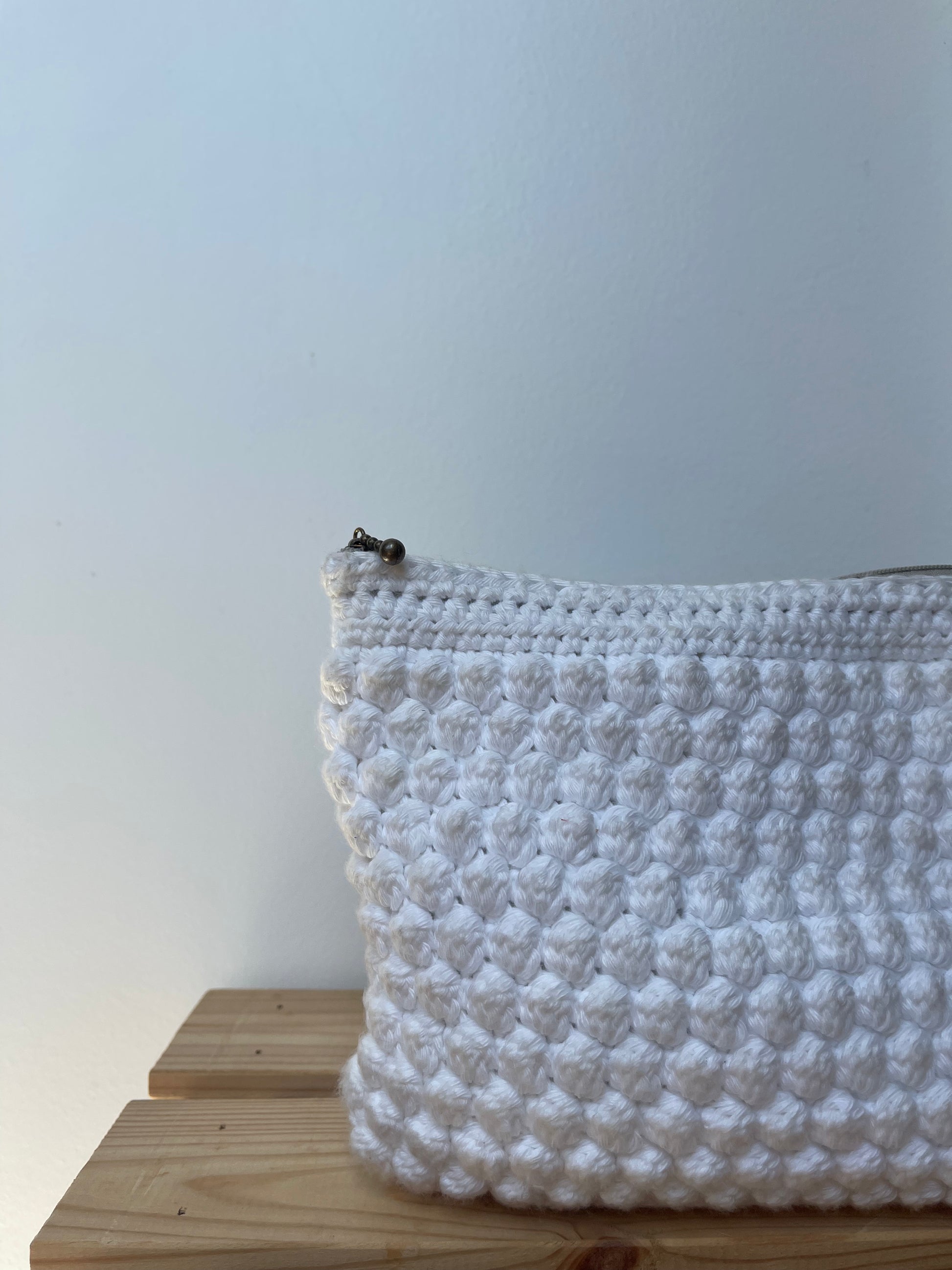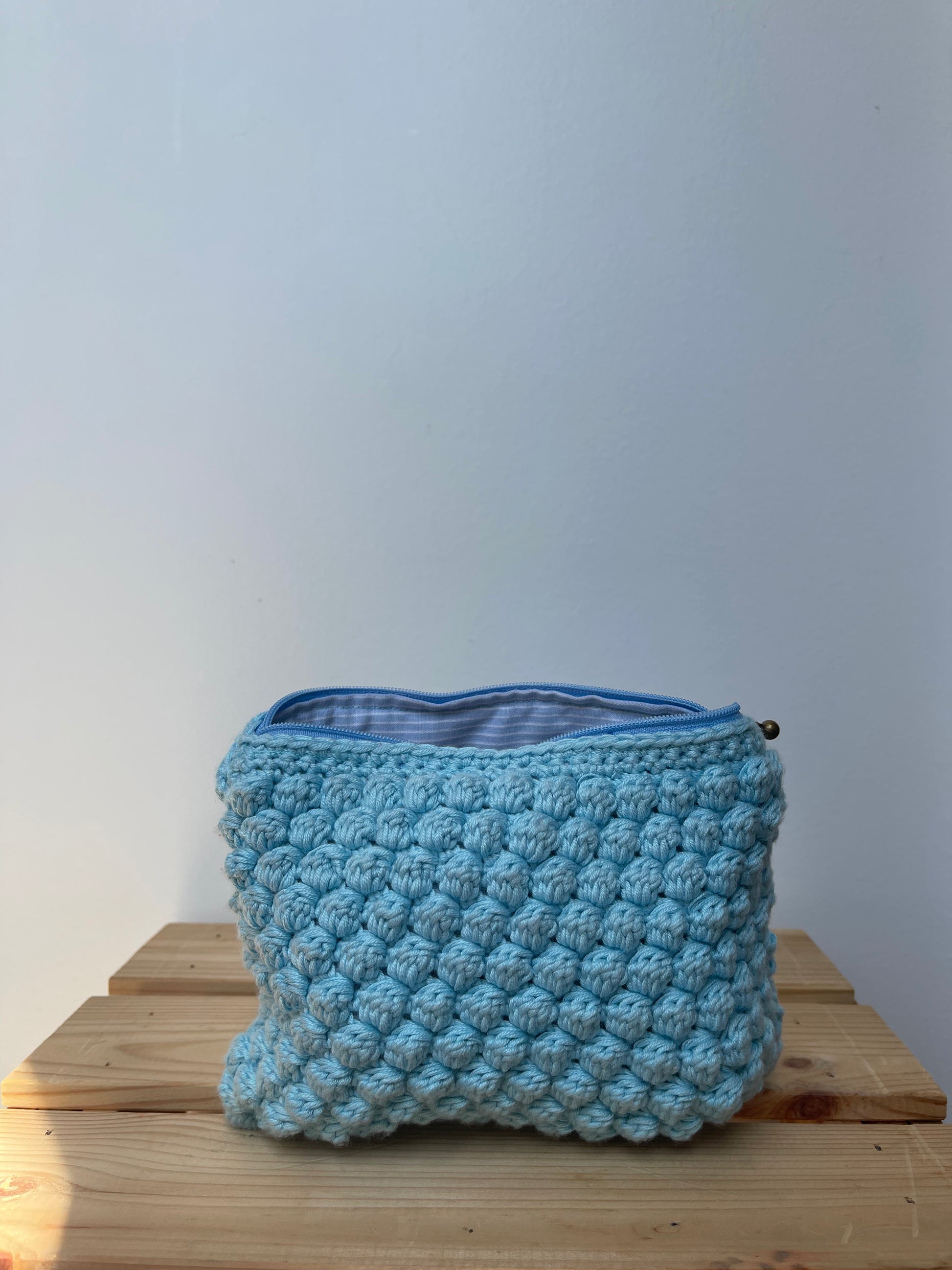 Cette pochette est réalisée en crochet à partir du point Bubble Stitch. Elle est doublée d'un tissu assorti et possède une fermeture éclair.