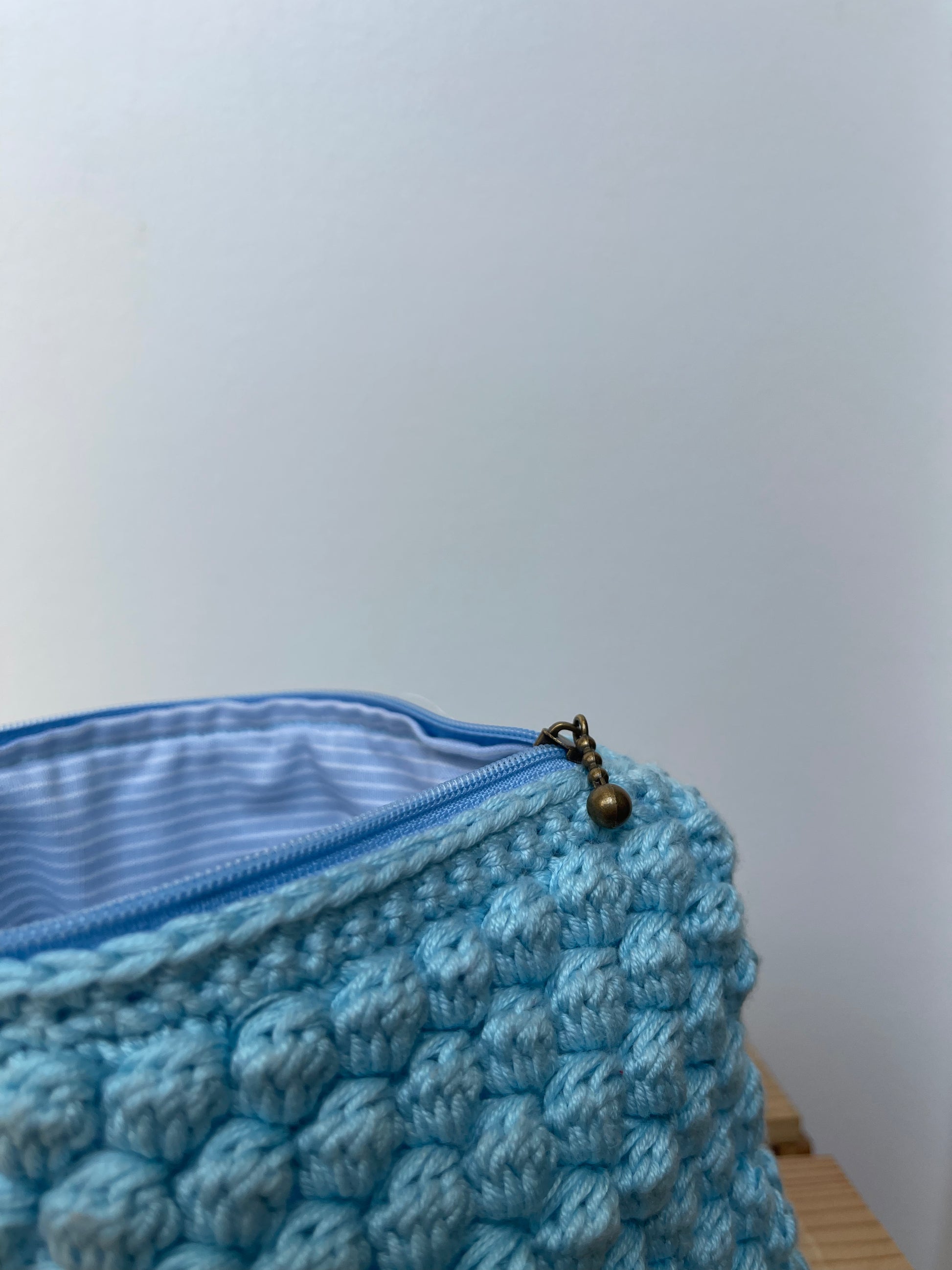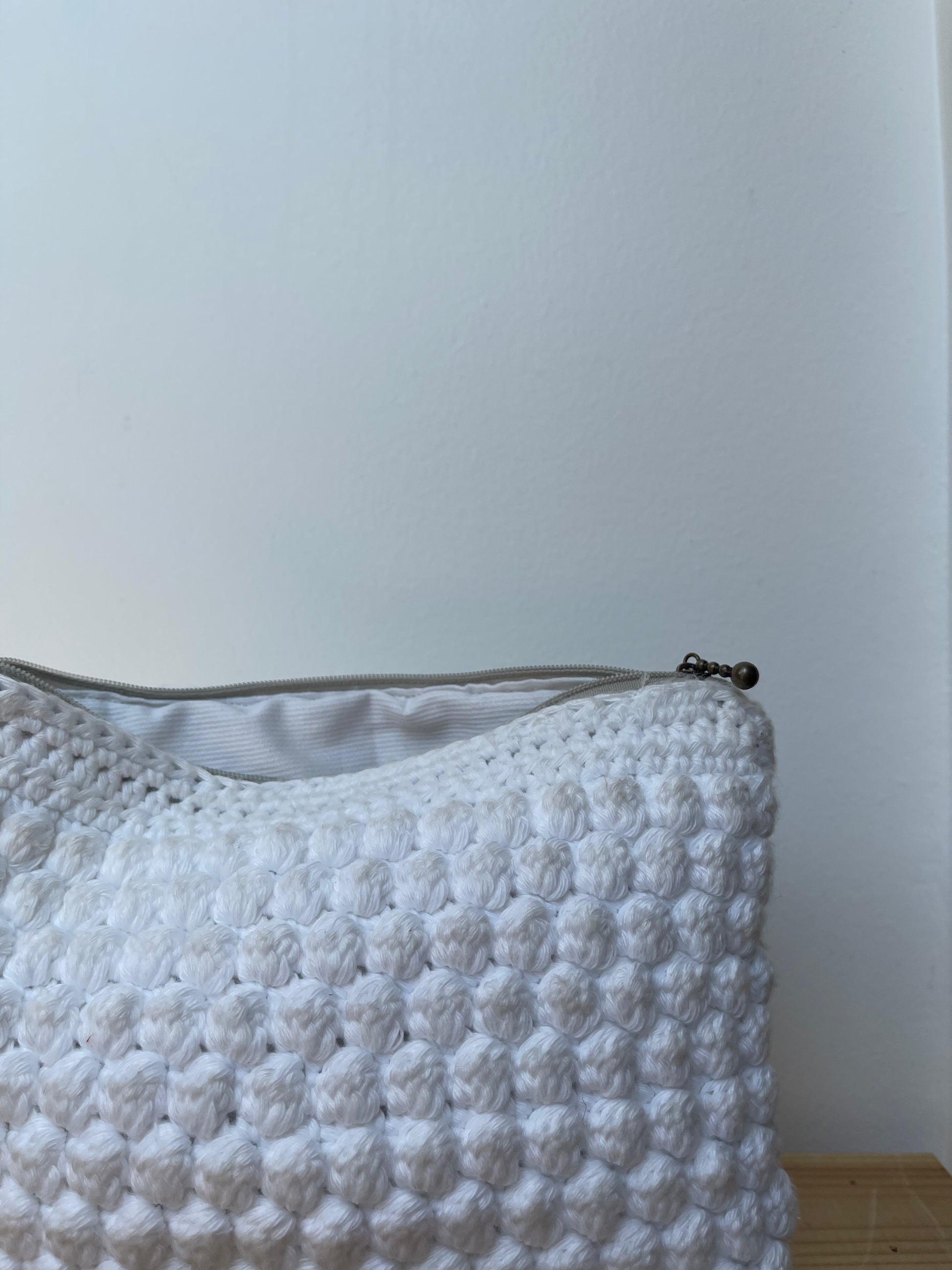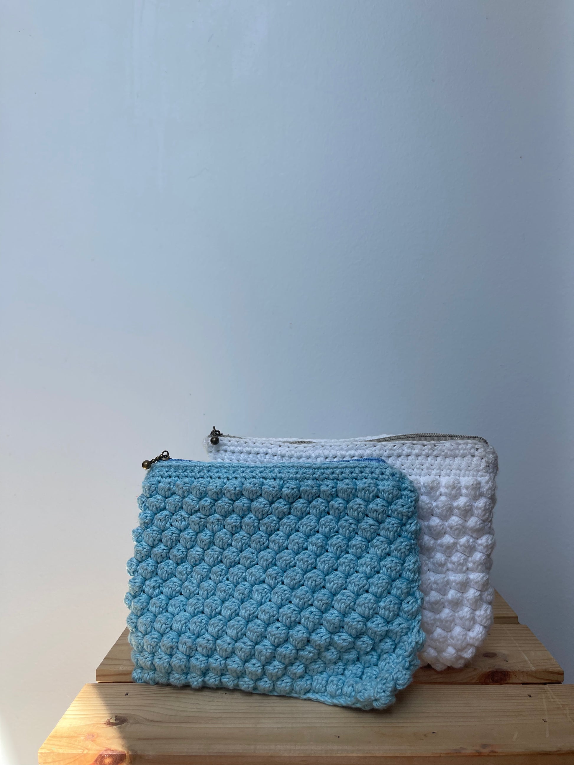 Cette pochette est réalisée en crochet à partir du point Bubble Stitch. Elle est doublée d'un tissu assorti et possède une fermeture éclair.